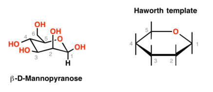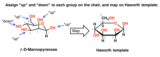 公约的椅子形式规定的吡喃糖环氧放置在下面的右上角的手这样的职位描述(糖的问题是β-D-mannose,吡喃糖的形式)。椅子的取向很重要:椅子的脚踏板”是在右边,也就是说,轴向取代基碳1分。