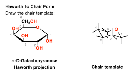 当然,我们也可以去相反的方向。的霍沃思α-D-galactofuranose如下所吸引。,将它转换为一个椅子,我们开始通过在椅子上模板(脚踏板上正确的)与环氧在每个碳区段和数量。