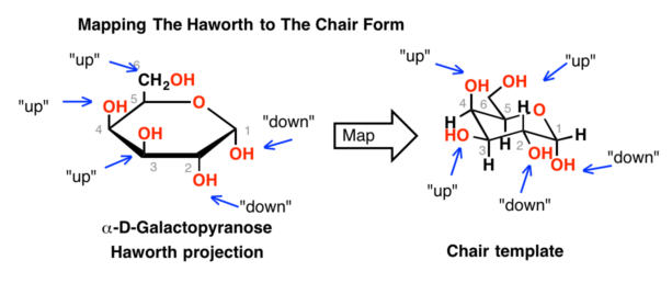 霍沃思投影简单地描绘了一个吡喃糖六角,呋喃糖作为五角大楼,取代基组放置直上直下。就这么简单。(注2)通过类比霍沃思,氧通常是放置在右上角位置与颈- 1把椅子的脚踏板”为了便于糖之间的比较。(注3]
